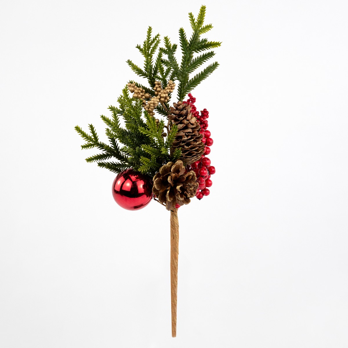 Ветка еловая с ягодами, шишками и шаром, 36см, зеленый/красный